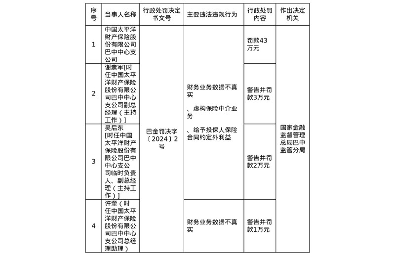 金融监管总局巴中监管分局近日开出4张罚单,剑指中国太平洋财产保险股份有限公司(下称“太保财险”)巴中中心支公司及其相关责任人。